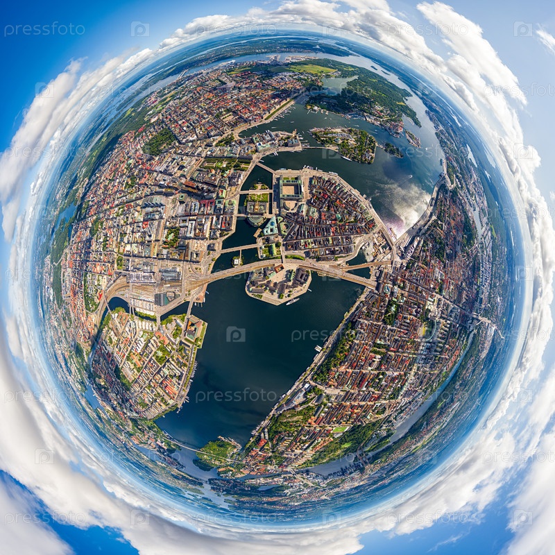 Стокгольм, Швеция. Риддархолмен. Панорама города летом в пасмурную погоду. 360-градусный панорамный астероид