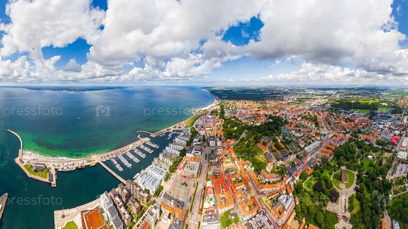 Хельсингборг, Швеция. Панорама города летом с портовой инфраструктурой. Оресундский пролив. Вид с воздуха