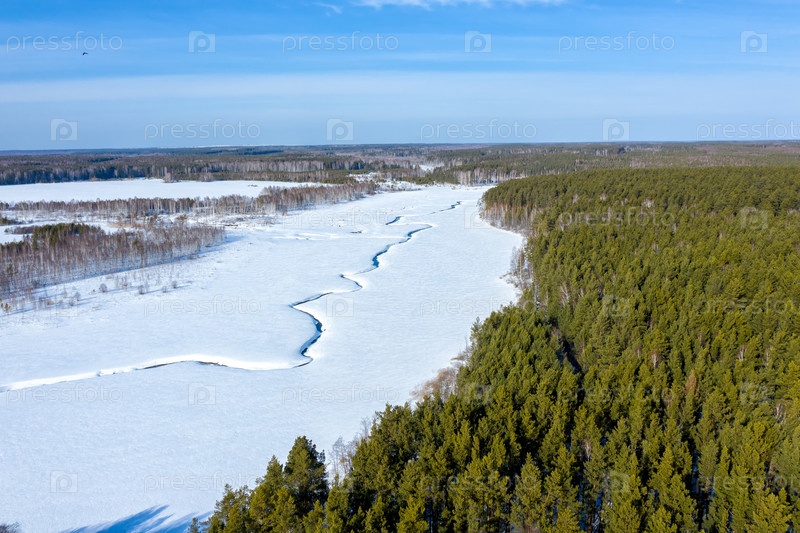 Поле, сосновый лес, болото под снегом. Маленькая река. Вид с воздуха в солнечную погоду