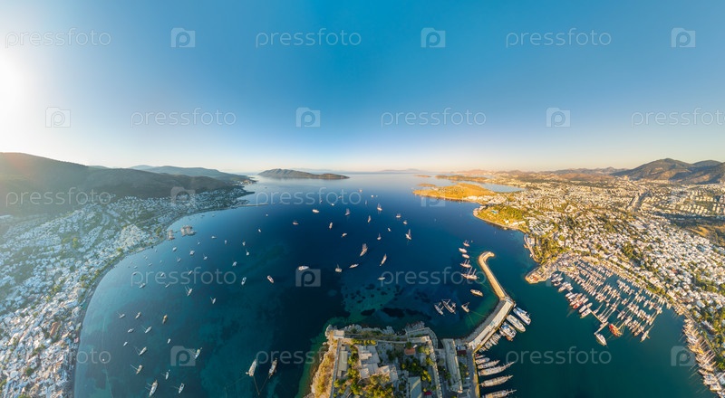 Бодрум, Турция. Широкая утренняя панорама, показывающая яхтенную пристань, замок Бодрум, яхты в заливе, пляжи, острова, холмы и ветряные мельницы Бодрума. Вид с воздуха