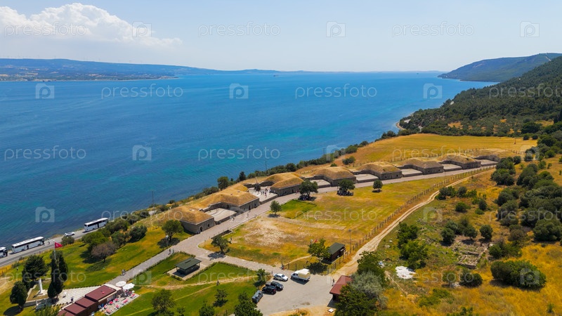 Килитбахир, Турция. Бастион Mecidiye на береговой линии с подробным видом на каменную архитектуру и водный путь Дарданелл. Вид с воздуха