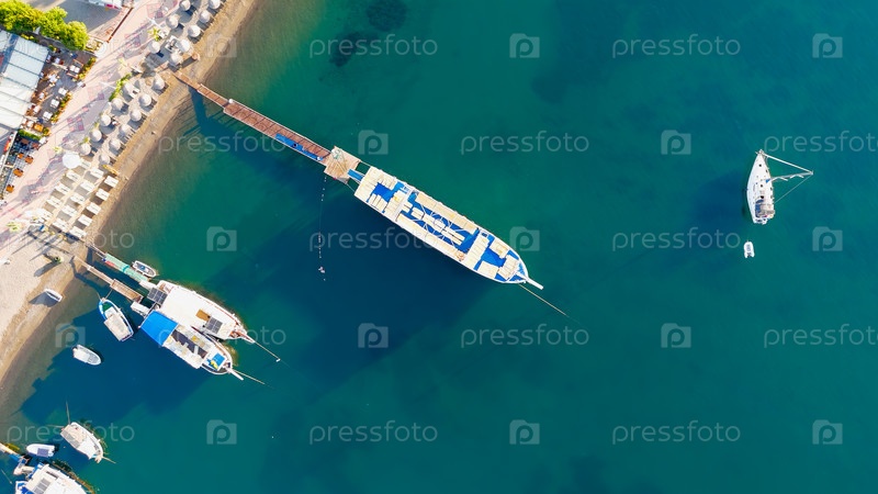 Мармарис, Турция. Концепция пляжного отдыха с лодкой на причале, песчаными пляжами и отелями утром. Спокойное море и готовый к новому дню. Вид с воздуха