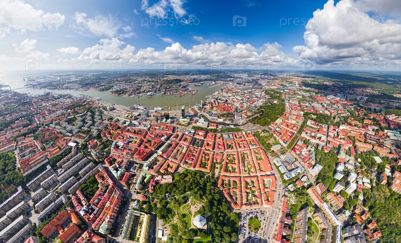 Гетеборг, Швеция. Скансен Кронан — крепостная башня. Панорама города летом в пасмурную погоду. Вид с воздуха