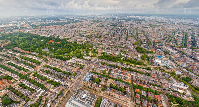 Амстердам, Нидерланды. Панорама города летним утром в пасмурную погоду. Вид с воздуха