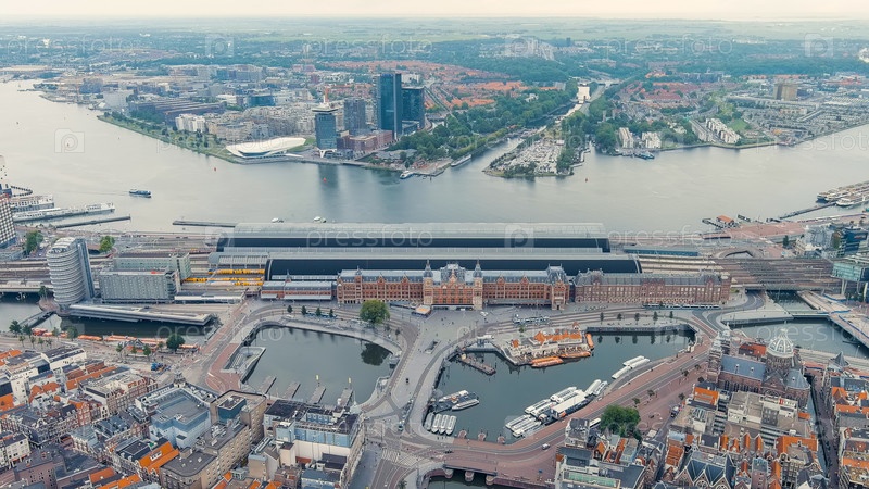 Амстердам, Нидерланды. Центральный вокзал Амстердама. Amsterdam Centraal — крупнейший железнодорожный вокзал города, построенный в 1889 году. Bay IJ (Амстердам), Aerial View