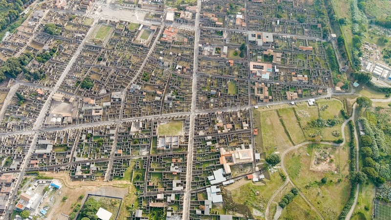 Помпеи, Италия. Помпеи — крупный древнеримский город, ныне крупный археологический комплекс. Общий вид сверху, вид с воздуха