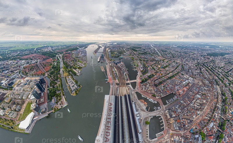 Амстердам, Нидерланды. Центральный железнодорожный вокзал. Панорама города летним утром в пасмурную погоду. Вид с воздуха