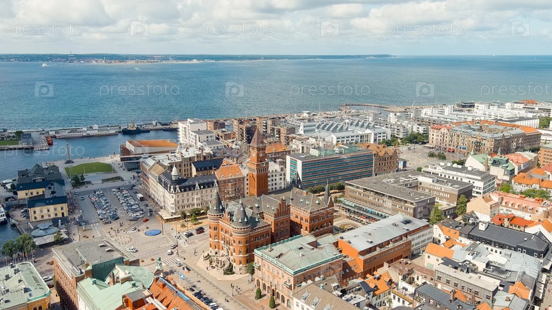 Хельсингборг, Швеция. Ратуша Хельсингборга. Летний день. Облачная погода, вид с воздуха