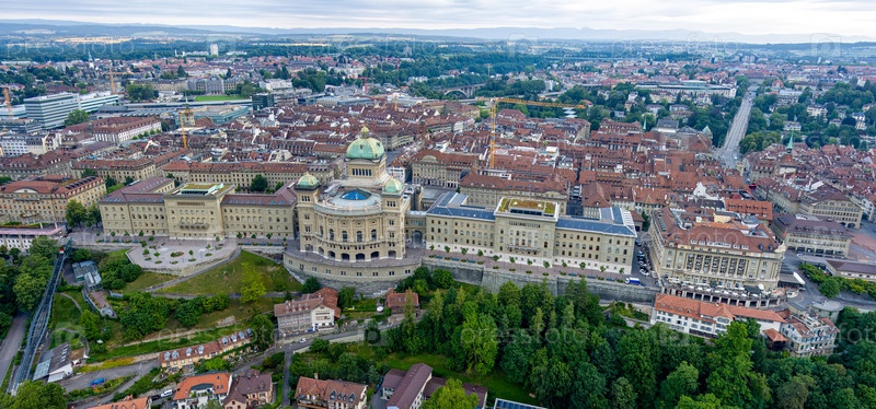 Берн, Швейцария. Федеральный дворец — Бундесхаус. Федеральная власть. Летним утром. Вид с воздуха