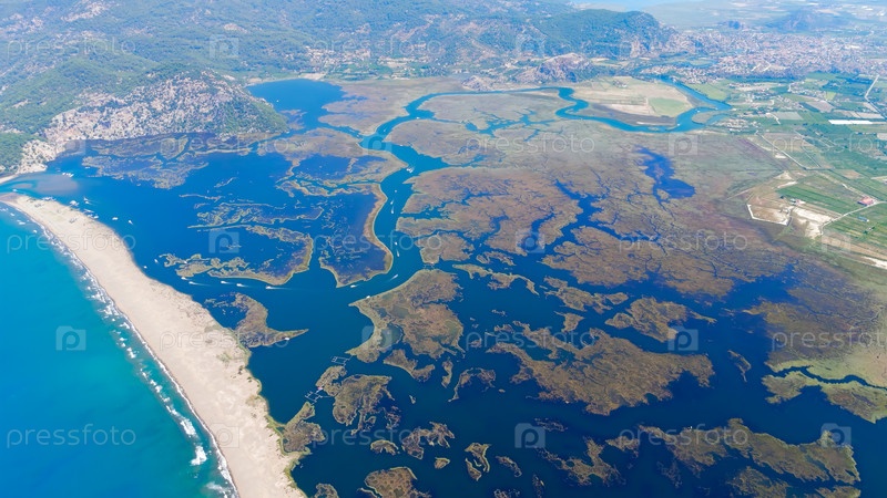 Дальян, Турция. Панорамные кадры дронов береговой линии пляжа Изтузу с каналами пролива Далянь, входящие волны и золотые песчаные образования. Вид с воздуха