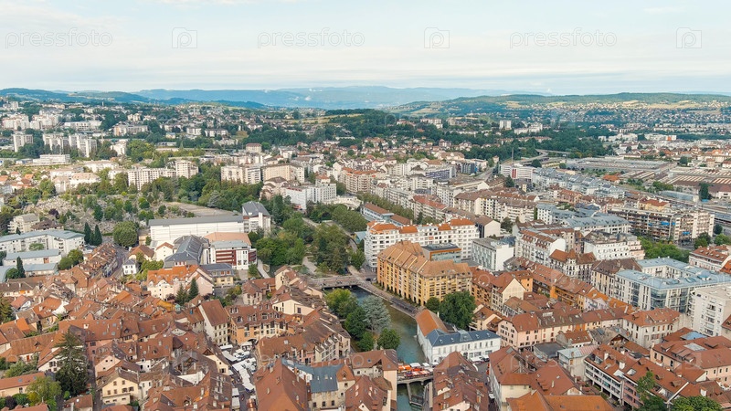 Анси, Франция. Исторический центр города с рекой Тиу. Анси - город в Альпах на юго-востоке Франции, вид с воздуха
