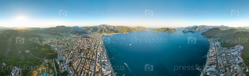 Мармарис, Турция. Цилиндрическая 360-градусная воздушная панорама побережья Мармарис с пляжами и отелями на закате. Широкий панорамный вид сверху. Вид с воздуха