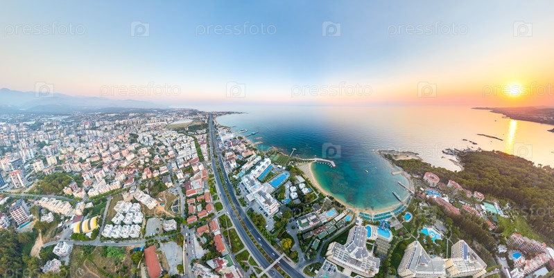 Авсаллар, Алания, Турция. Широкая воздушная панорама над шоссе D400 в золотой час, бирюзовый залив, песчаные бухты и приморские отели, видимое солнце. Вид с воздуха