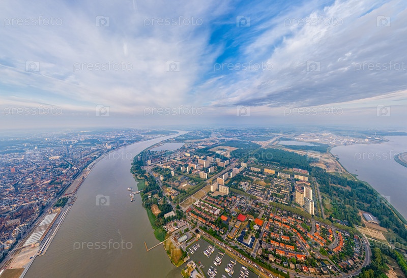 Антверпен, Бельгия. Панорама города. Река Шельда (Escout). Летним утром. Вид с воздуха