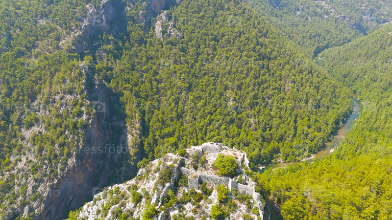 Какаллар, Алания, Турция. Вид с воздуха на исторические руины замка Алара на отдаленном горном месте с зеленой долиной внизу. Вид с воздуха
