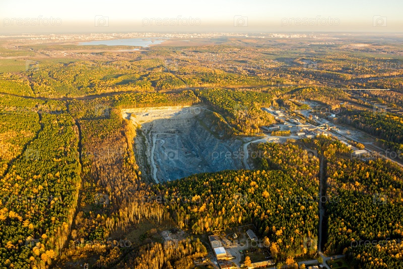 Каменный карьер среди леса. Пролетая над осенним смешанным лесом во время заката. Урал, Россия. Вдалеке виден город Екатеринбург