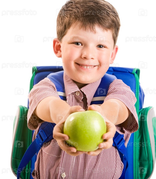 Мальчик с рюкзаком держит в руках зеленое яблоко, изолированный на белом фоне