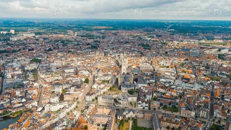 Гент, Бельгия. Кафедральный собор Святого Баво. Панорама центрального города с воздуха. Облачная погода, летний день, вид с воздуха