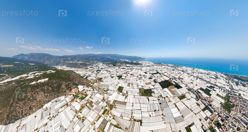 Демре, Турция. Экологический обзор сверху, показывающий различные слои ландшафта города, обширные тепличные фермы и естественные границы моря и гор. Вид с воздуха