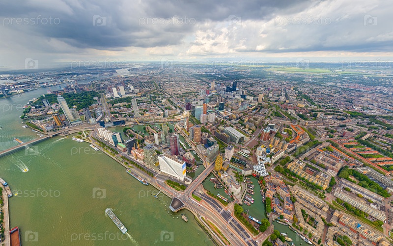 Роттердам, Нидерланды. Панорама летнего города в дождливую погоду. Облака. Вид с воздуха