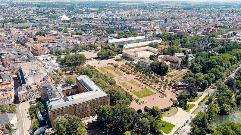Мец, Франция. Сад Эспланада. Вид на исторический центр города. Лето, солнечный день, вид с воздуха