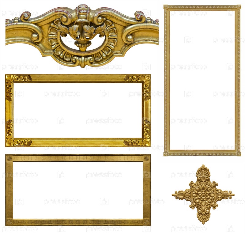Набор золотых рамок для картин, зеркал или фотографий, изолированных на белом фоне