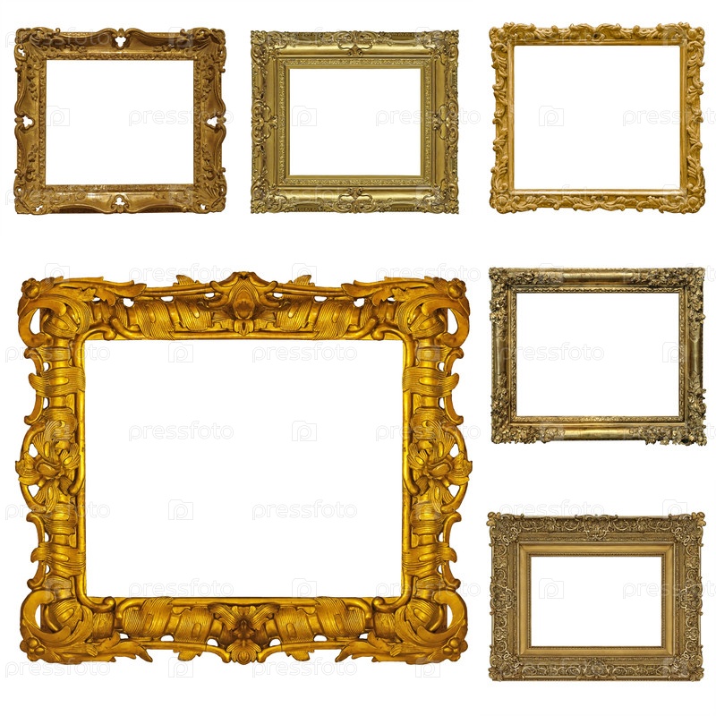 Набор золотых рамок для картин, зеркал или фотографий, изолированных на белом фоне