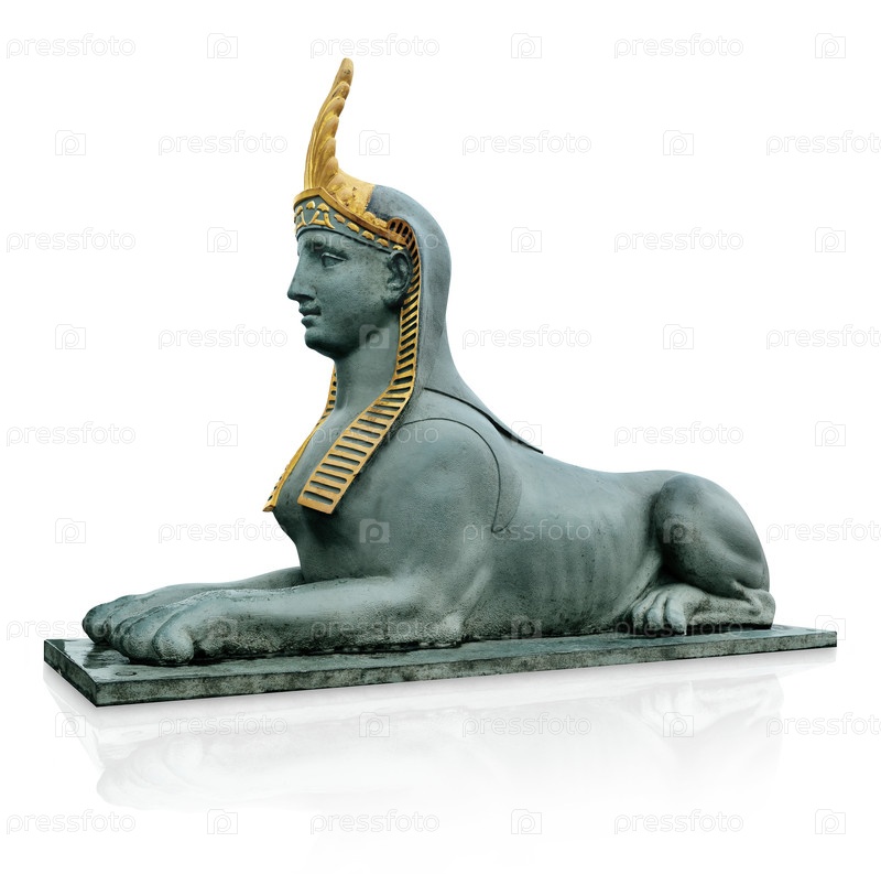 Бронзовый сфинкс с золотой короной в египетском стиле. Элемент дизайна с обрезкой пути