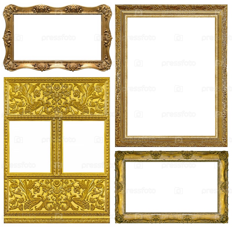 Набор золотых рамок для картин, зеркал или фотографий, изолированных на белом фоне