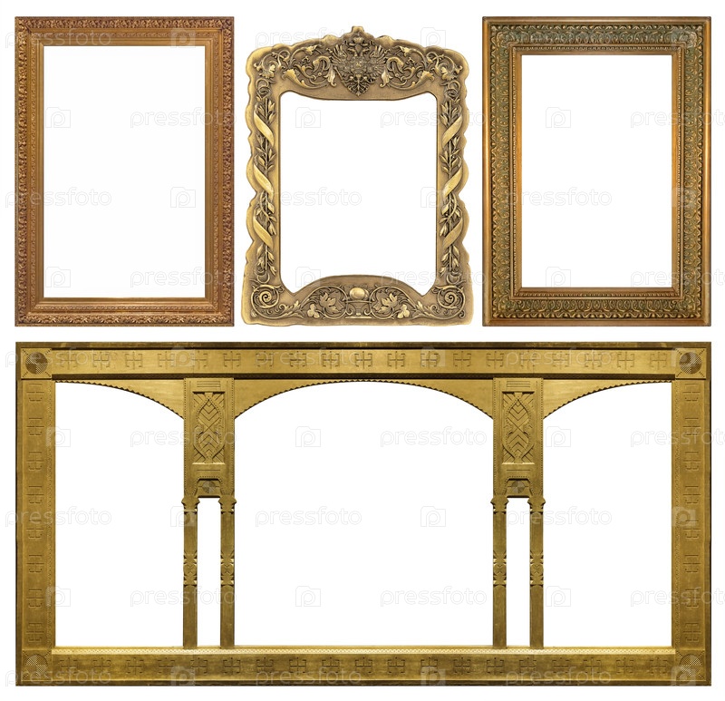 Набор золотых рамок для картин, зеркал или фотографий, изолированных на белом фоне