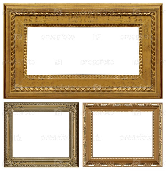 Набор золотых рамок для картин, зеркал или фотографий, изолированных на белом фоне