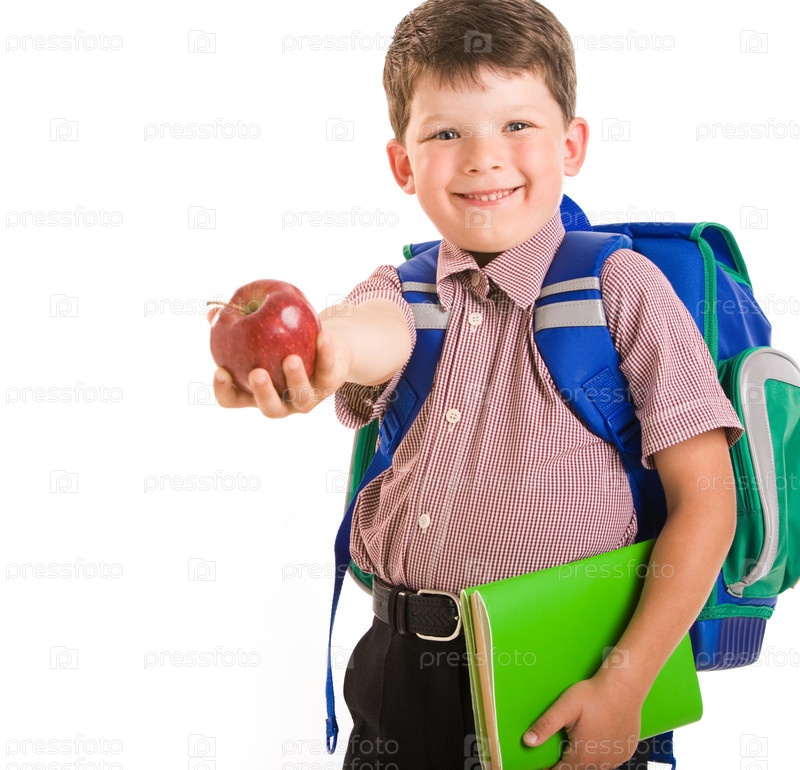 Мальчик с рюкзаком держит в руках красное яблоко, изолированный на белом фоне