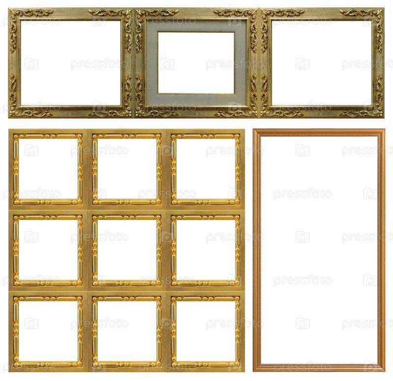 Набор золотых рамок для картин, зеркал или фотографий, изолированных на белом фоне