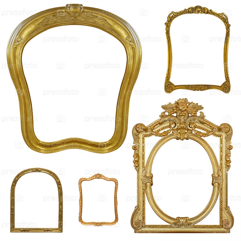 Набор золотых рамок для картин, зеркал или фотографий, изолированных на белом фоне
