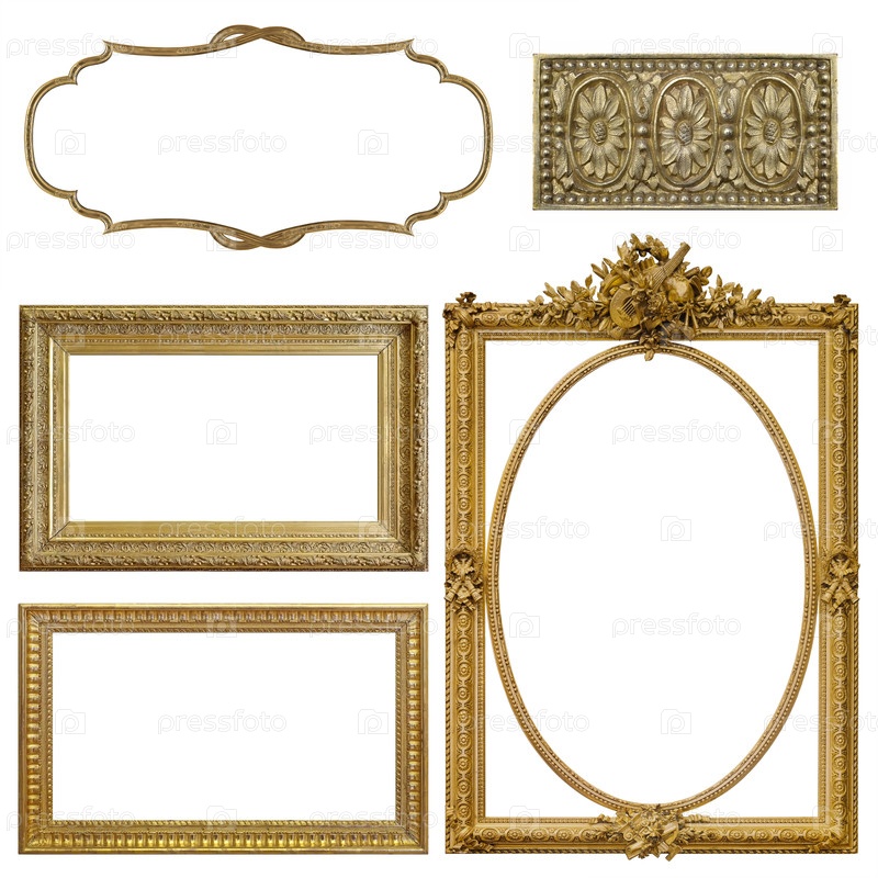 Набор золотых рамок для картин, зеркал или фотографий, изолированных на белом фоне