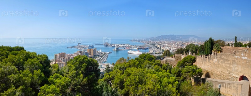 Панорамный вид на гавань Малаги со стен Алькасабы, Испания, летний пейзаж