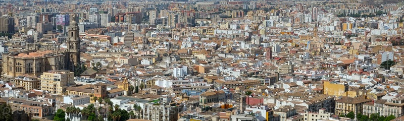 Панорамный вид с высоты птичьего полета на город Малага с готическим собором и современным горизонтом