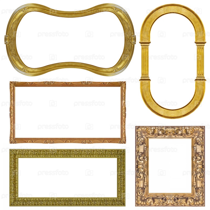 Набор золотых рамок для картин, зеркал или фотографий, изолированных на белом фоне