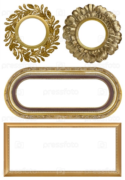 Набор золотых рамок для картин, зеркал или фотографий, изолированных на белом фоне