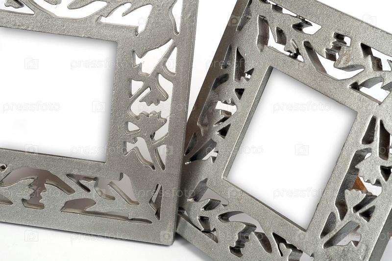 Две серебряные рамы для картин, зеркал или фото в лобном и перспективном виде, изолированные на белом фоне, вырез готов