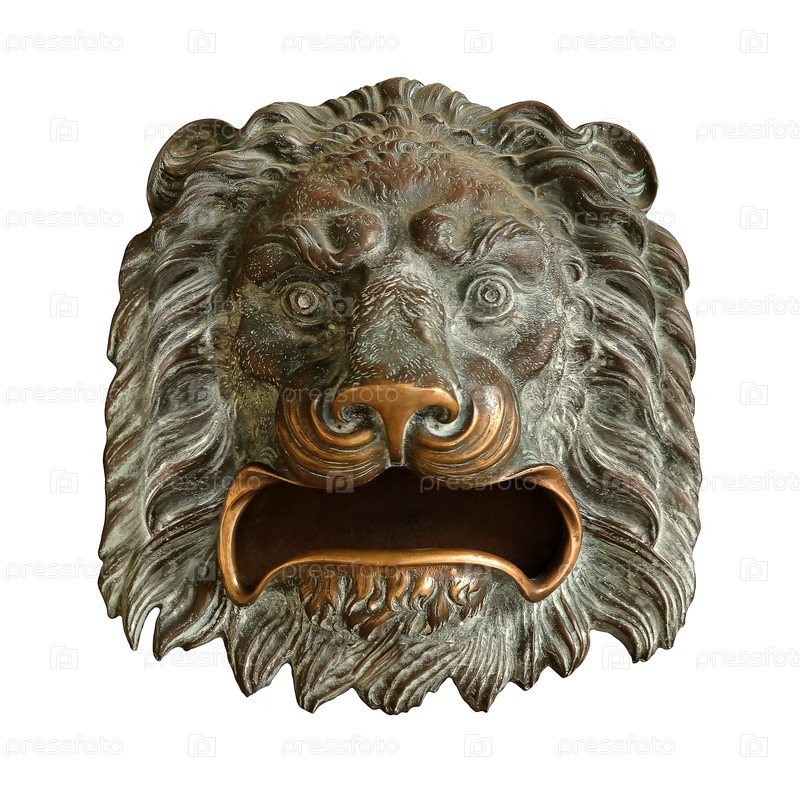Декоративный элемент в виде бронзовой головы льва изолирован на белом фоне