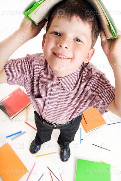 Мальчик держит открытую книгу над головой, изолированный на белом фоне