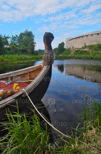 Реконструкция драккара у стен Староладожской крепости летом, Старая Ладога, Россия
