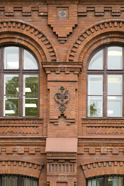 Архитектурные детали исторического завода из красного кирпича. Орнаментальная кирпичная кладка и арочные окна