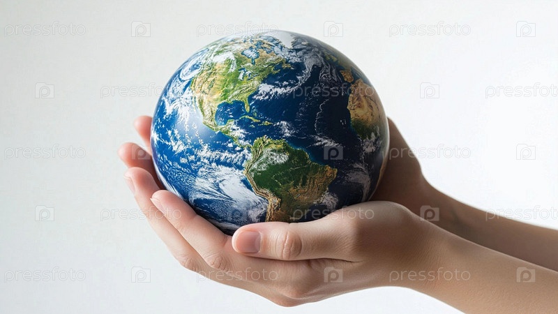 Руки держат макет планеты Земля на однотонном фоне