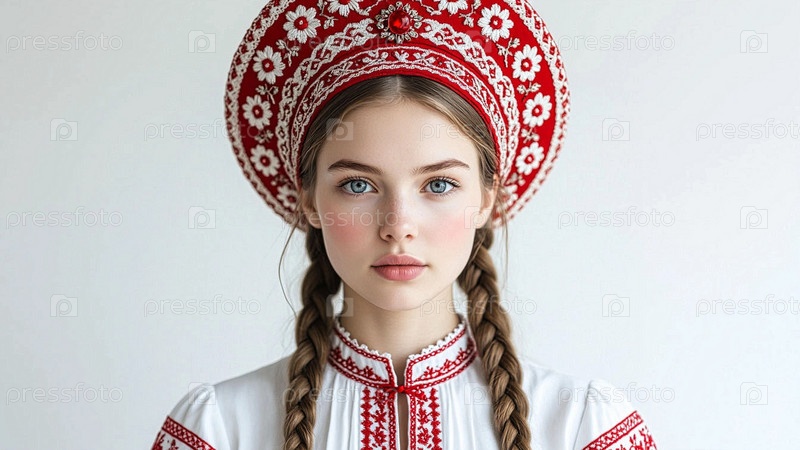 Красивая девушка в традиционном русском национальном костюме с кокошником на голове