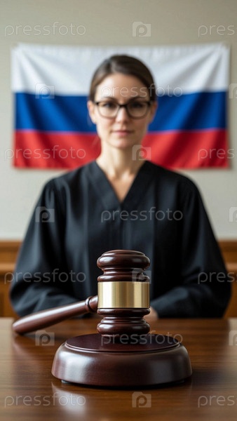 Судейский молоток крупный план. Судья женщина одета в судебную мантию на заднем плане. Российский суд, судья с молотком правосудия