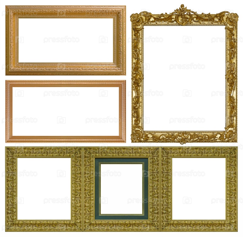 Набор золотых рамок для картин, зеркал или фотографий, изолированных на белом фоне