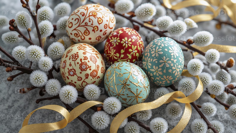 Нарисованные вручную пасхальные яйца с ветвями Pussy Willow