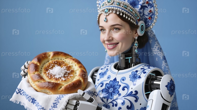 Робот в традиционном русском народном костюме с голубыми цветочными узорами, держащий круглую буханку хлеба с солью на вышитом полотенце, синий фон